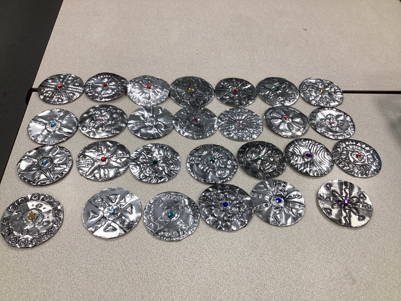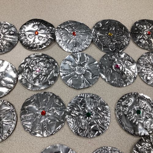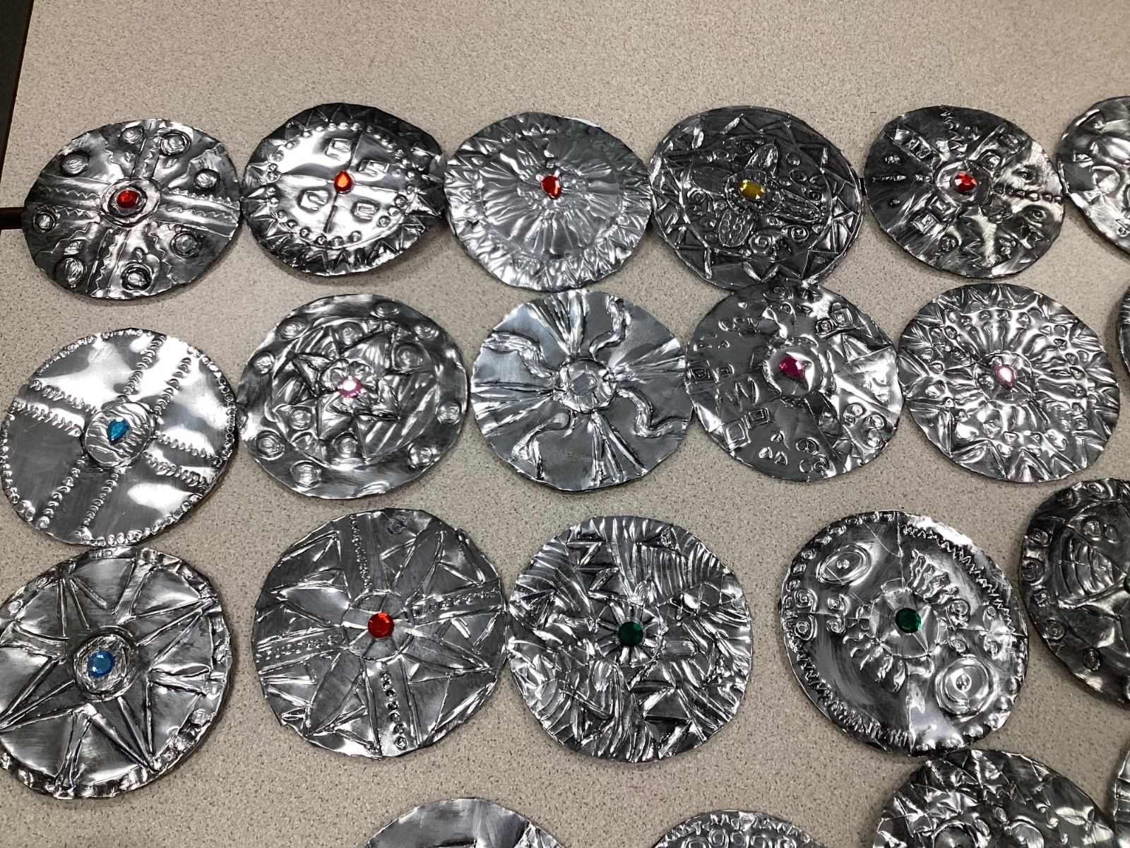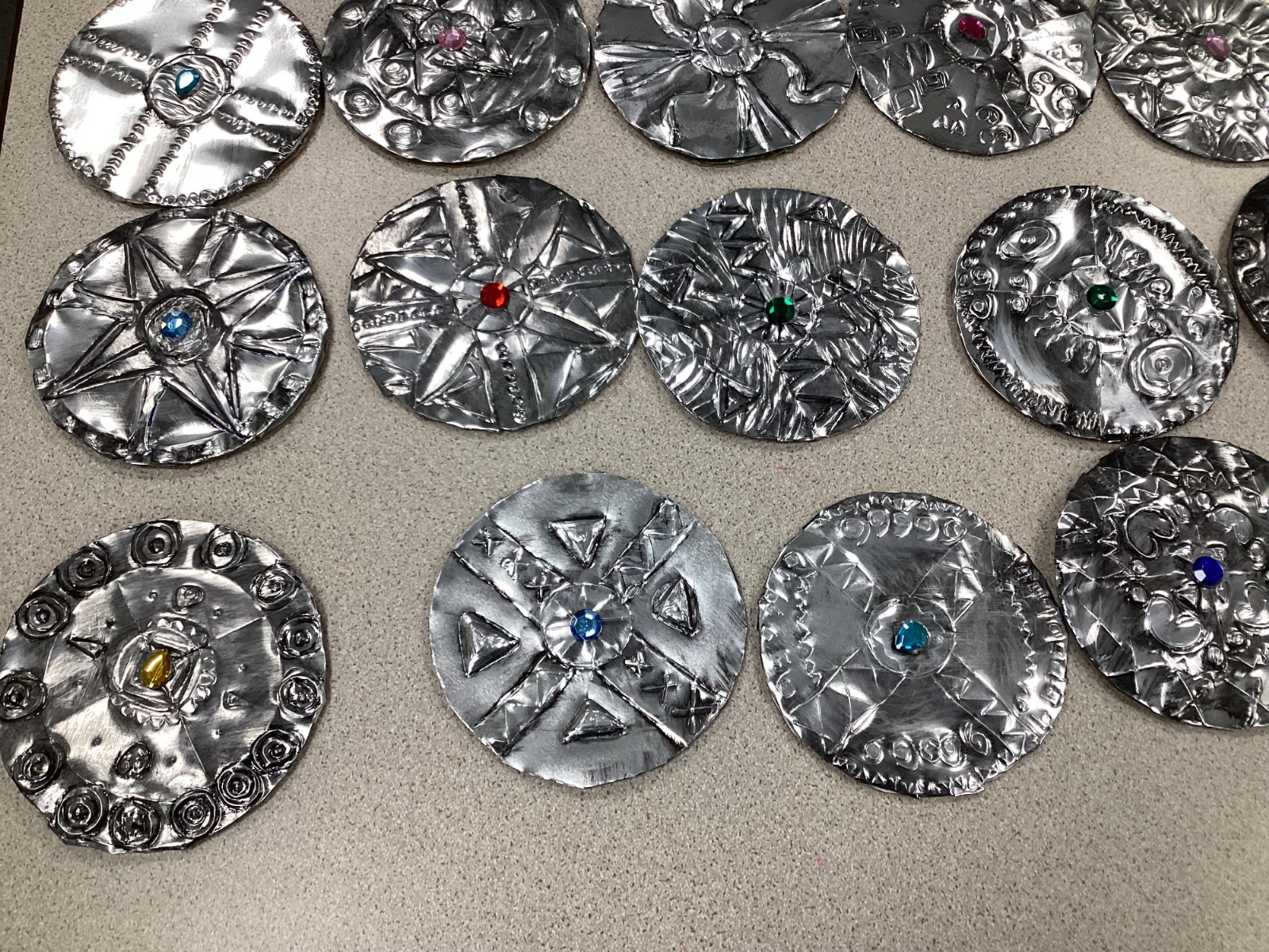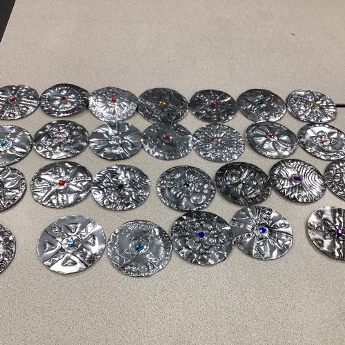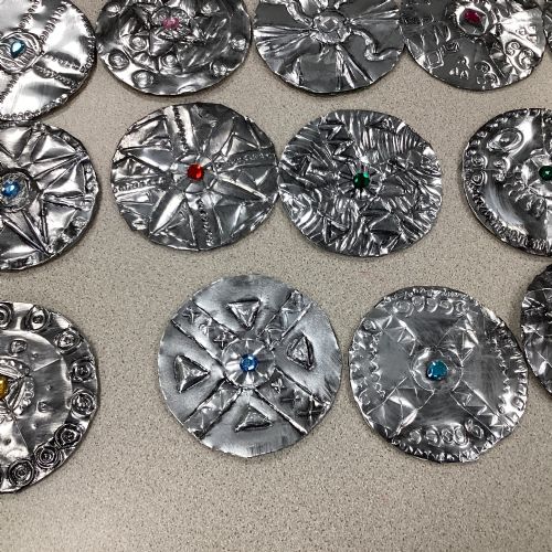 The children began by exploring real Anglo-Saxon brooches, studying museum images to spot patterns, symbols and shapes used over a thousand years ago. Inspired by these historic designs, we sketched our own brooch ideas, thinking carefully about symmetry and detail. We then used embossing and debossing techniques on metal to bring our designs to life.