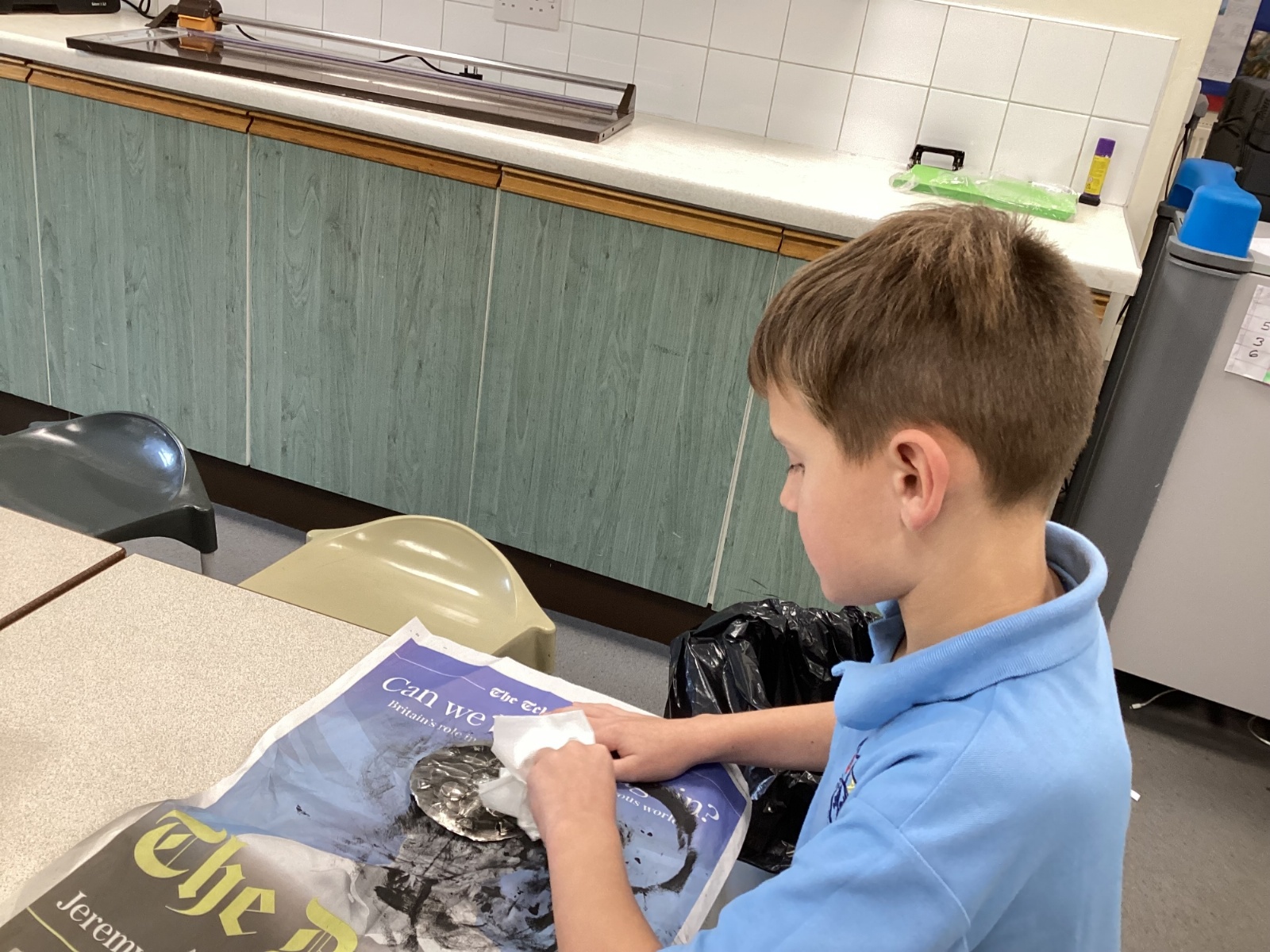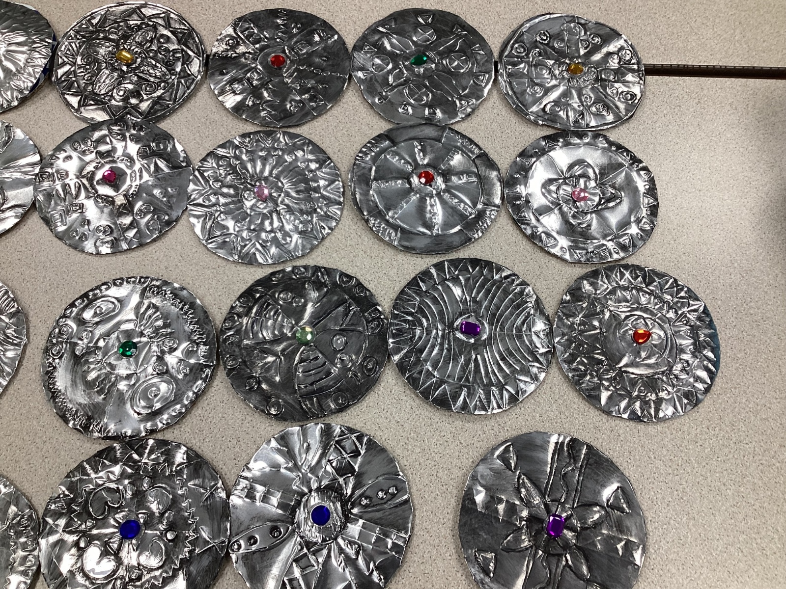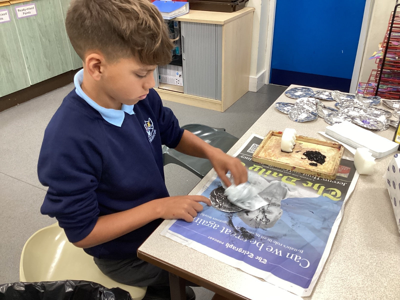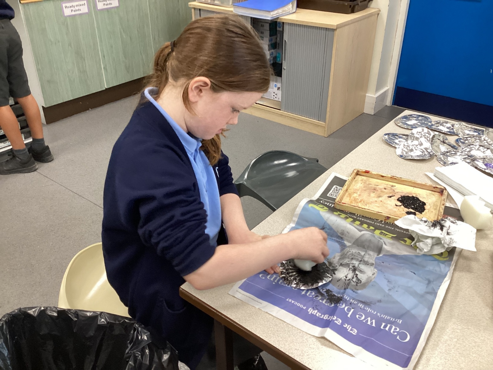 The children began by exploring real Anglo-Saxon brooches, studying museum images to spot patterns, symbols and shapes used over a thousand years ago. Inspired by these historic designs, we sketched our own brooch ideas, thinking carefully about symmetry and detail. We then used embossing and debossing techniques on metal to bring our designs to life.